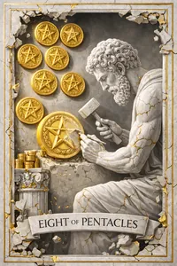 The Eight of Pentacles teaches that genius is one percent talent and ninety-nine percent effort. Love your craft, do it well, and you will be rewarded with stability and respect.
