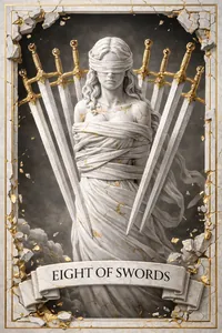 The Eight of Swords is a card of mental traps. Its meaning is a situation where you feel powerless and stuck, but the limits are often exaggerated or imagined.