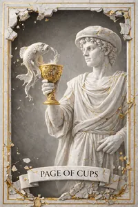 The Page of Cups is the "inner child" of the emotional suit. He represents the first stirrings of a new feeling—whether art, love, or spiritual insight. He is gentle, artistic, and entirely open to the world.