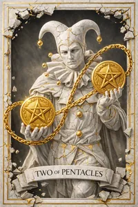The Two of Pentacles teaches lightness. Do not let routine drown you. Be like water, taking the shape of the vessel. Life is a game, and the winner adapts as the rules change.