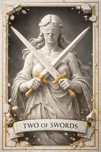 You are at a crossroads where neither path feels right. The Two of Swords is a pause—a search for the answer within while shutting out the world.